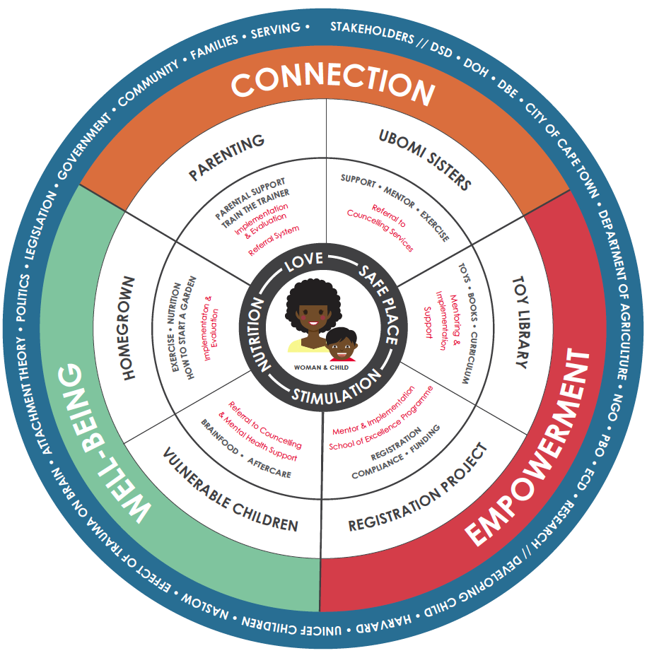 Learn2Live has designed an integrated change model to holistically approach the development and overall well-being of a child, through the main focus areas of stimulation, nutrition, love and safety.